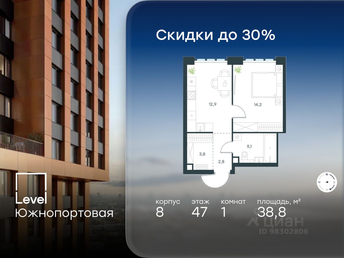 В северной части района Печатники продается 1-комнатная квартира площадью 38.80 кв.м без отделки. Квартира расположена на 47 этаже 49-этажного корпуса 8 в жилом комплексе комфорт-класса Level Южнопортовая (компания Level Group/Левел групп).