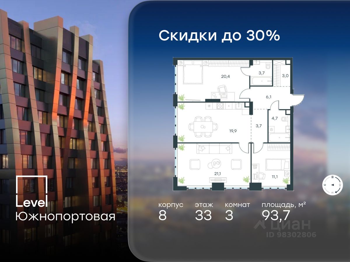 В северной части района Печатники продается 3-комнатная квартира площадью 93.70 кв.м без отделки. Квартира расположена на 33 этаже 49-этажного корпуса 8 в жилом комплексе комфорт-класса Level Южнопортовая (компания Level Group/Левел групп).