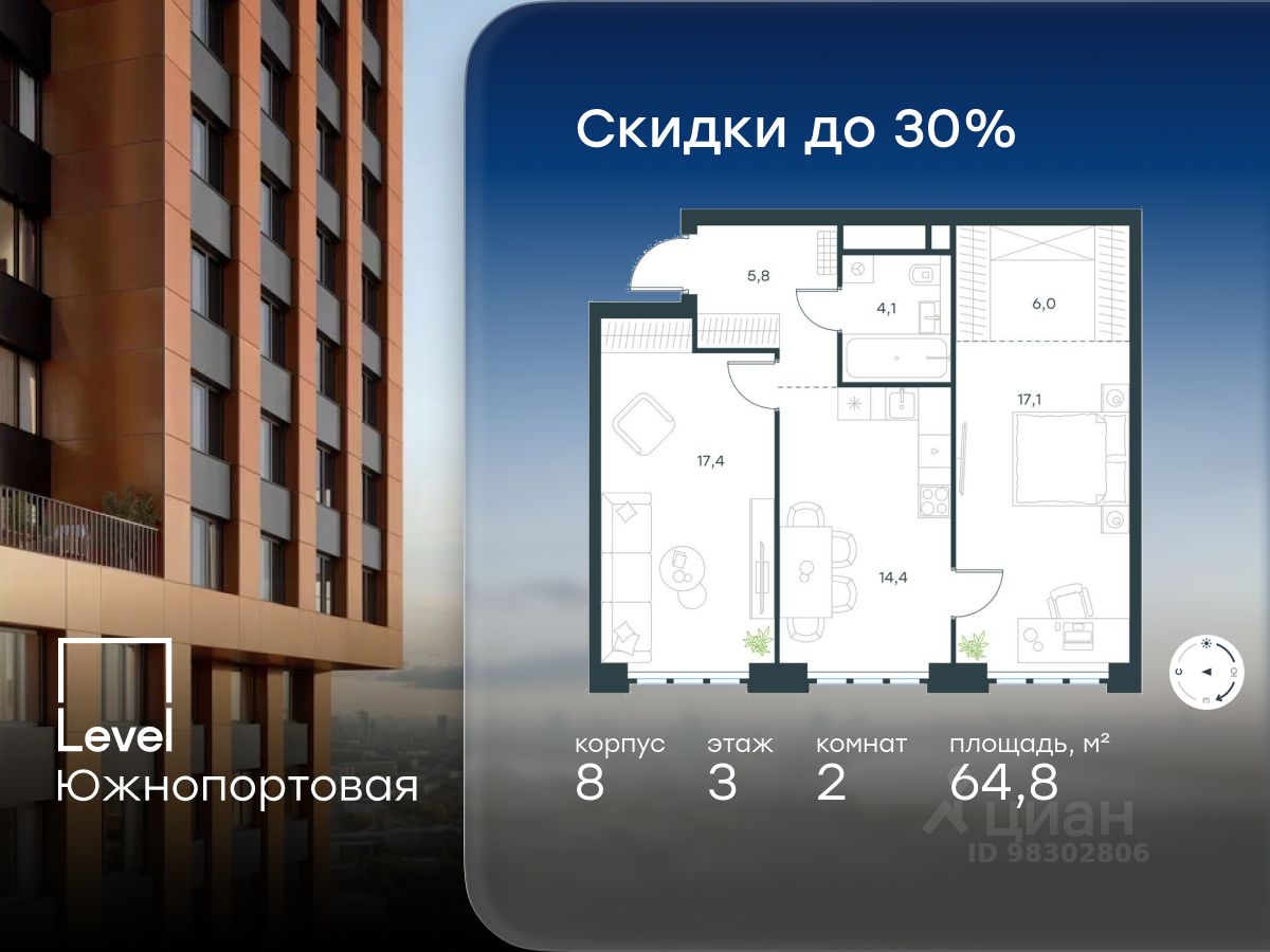 В северной части района Печатники продается 2-комнатная квартира площадью 64.80 кв.м без отделки. Квартира расположена на 3 этаже 49-этажного корпуса 8 в жилом комплексе комфорт-класса Level Южнопортовая (компания Level Group/Левел групп).