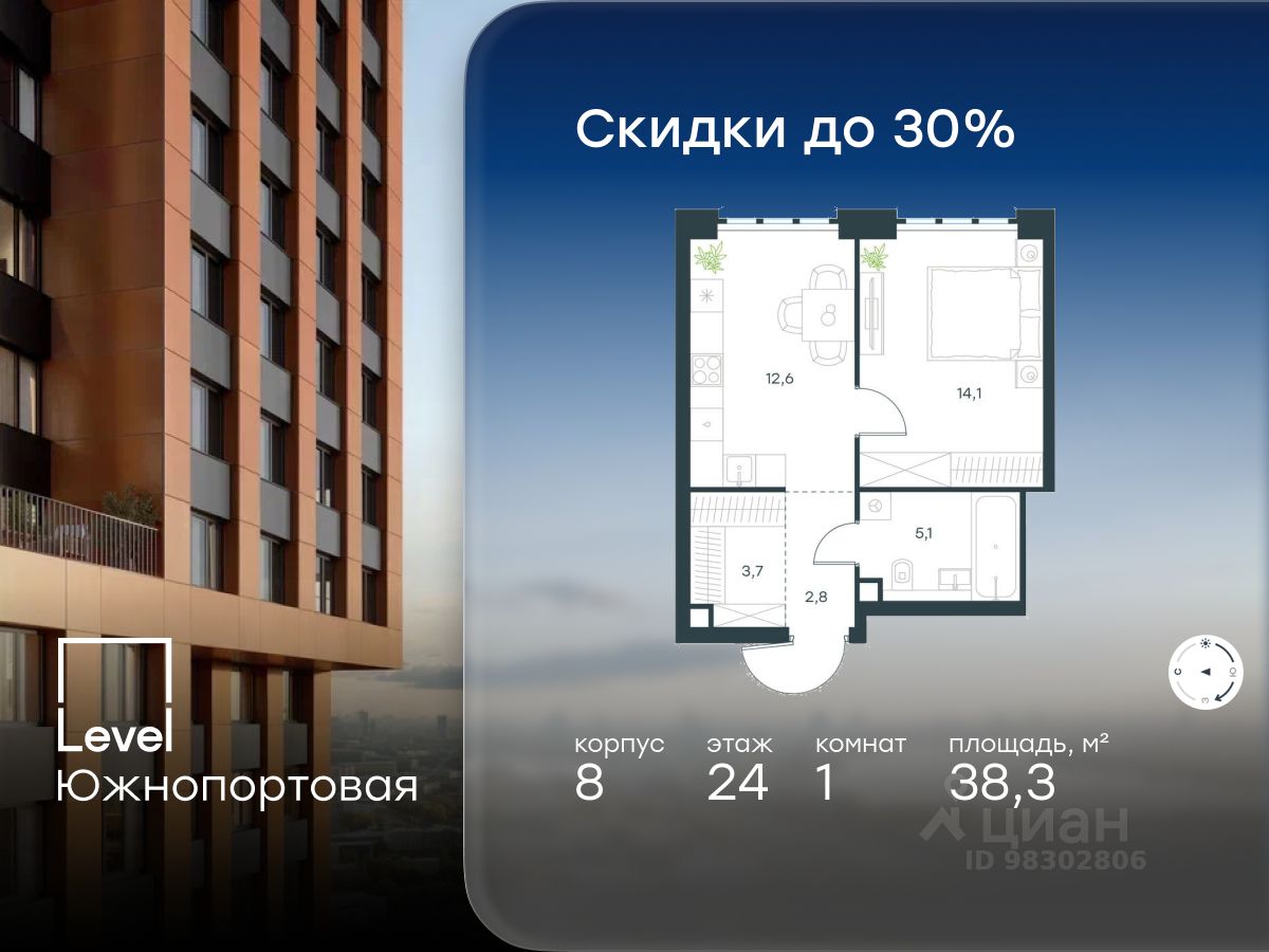 В северной части района Печатники продается 1-комнатная квартира площадью 38.30 кв.м без отделки. Квартира расположена на 24 этаже 49-этажного корпуса 8 в жилом комплексе комфорт-класса Level Южнопортовая (компания Level Group/Левел групп).