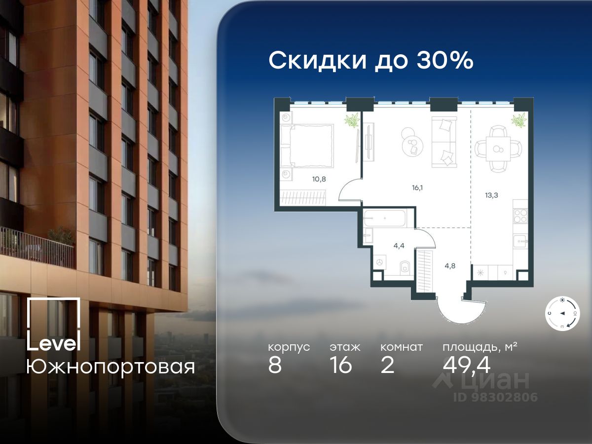 В северной части района Печатники продается 2-комнатная квартира площадью 49.40 кв.м без отделки. Квартира расположена на 16 этаже 49-этажного корпуса 8 в жилом комплексе комфорт-класса Level Южнопортовая (компания Level Group/Левел групп).