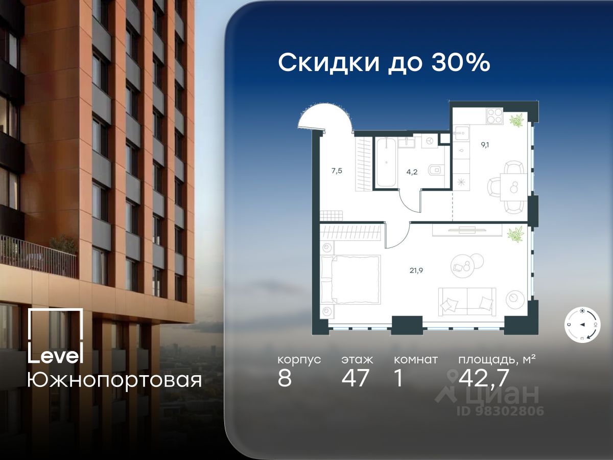 В северной части района Печатники продается 1-комнатная квартира площадью 42.70 кв.м без отделки. Квартира расположена на 47 этаже 49-этажного корпуса 8 в жилом комплексе комфорт-класса Level Южнопортовая (компания Level Group/Левел групп).