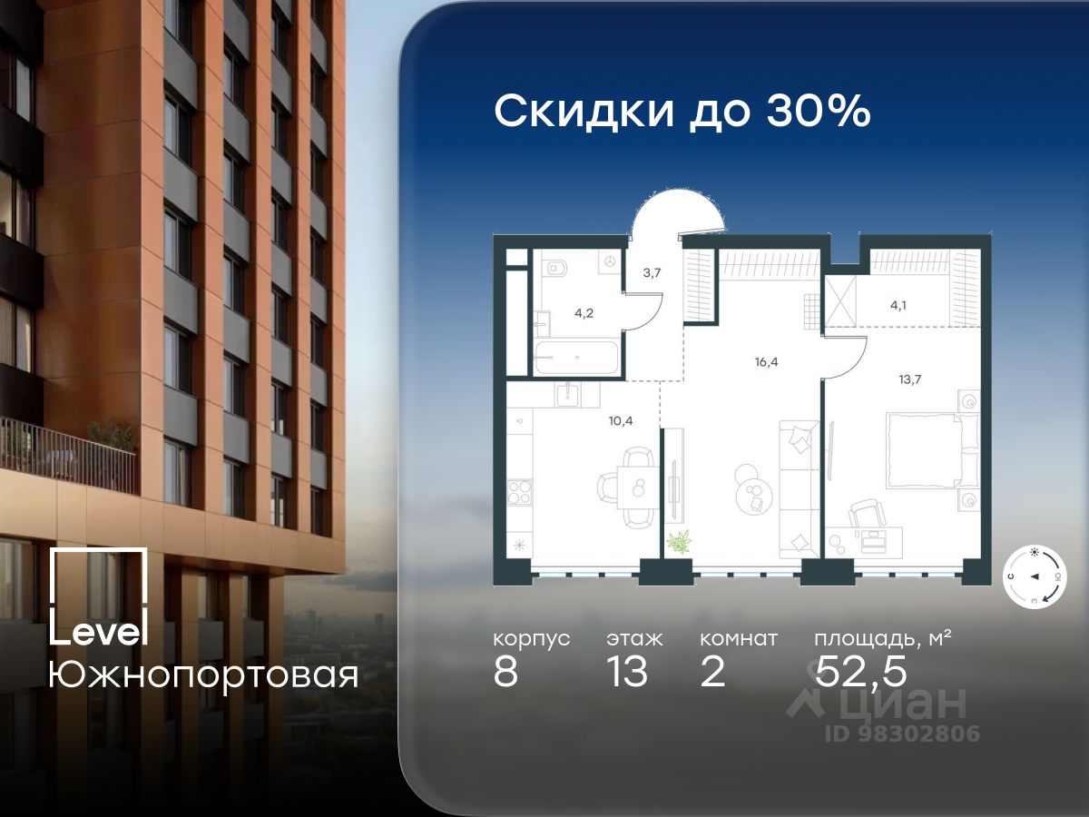 В северной части района Печатники продается 2-комнатная квартира площадью 52.50 кв.м без отделки. Квартира расположена на 13 этаже 49-этажного корпуса 8 в жилом комплексе комфорт-класса Level Южнопортовая (компания Level Group/Левел групп).
