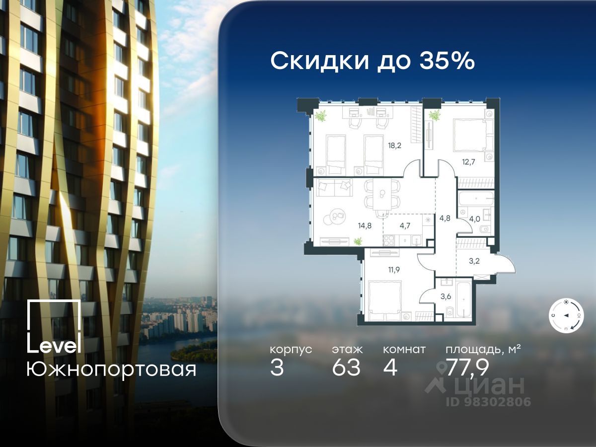 В северной части района Печатники продается 4-комнатная квартира площадью 77.90 кв.м без отделки. Квартира расположена на 63 этаже 68-этажного корпуса 3 в жилом комплексе комфорт-класса Level Южнопортовая (компания Level Group/Левел групп).