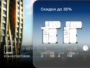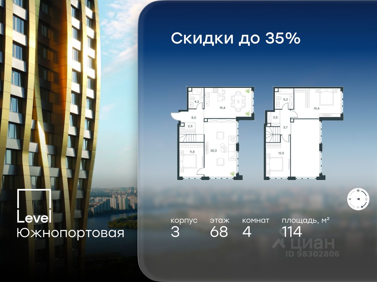 В северной части района Печатники продается 4-комнатная квартира площадью 114.00 кв.м без отделки. Квартира расположена на 68 этаже 68-этажного корпуса 3 в жилом комплексе комфорт-класса Level Южнопортовая (компания Level Group/Левел групп).