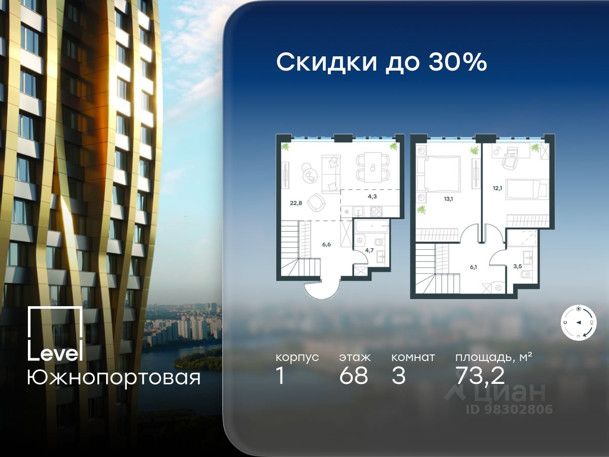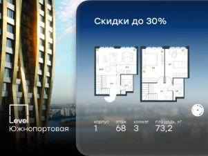 В северной части района Печатники продается 3-комнатная квартира площадью 73.20 кв.м без отделки. Квартира расположена на 68 этаже 69-этажного корпуса 1 в жилом комплексе комфорт-класса Level Южнопортовая (компания Level Group/Левел групп).
