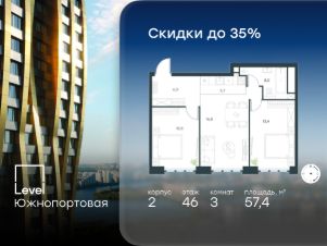 В северной части района Печатники продается 3-комнатная квартира площадью 57.40 кв.м без отделки. Квартира расположена на 46 этаже 47-этажного корпуса 2 в жилом комплексе комфорт-класса Level Южнопортовая (компания Level Group/Левел групп).