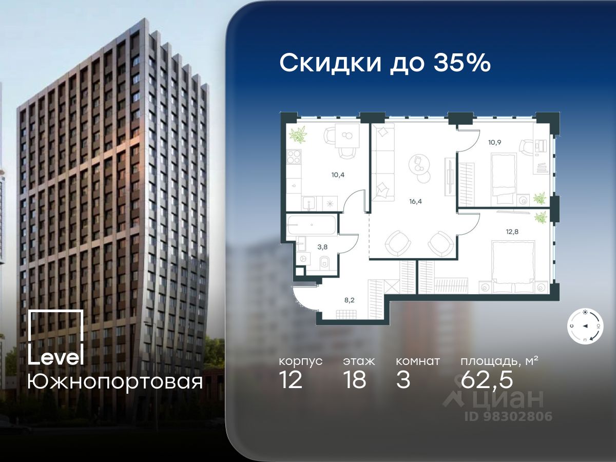 В северной части района Печатники продается 3-комнатная квартира площадью 62.50 кв.м без отделки. Квартира расположена на 18 этаже 20-этажного корпуса 12 в жилом комплексе комфорт-класса Level Южнопортовая (компания Level Group/Левел групп).