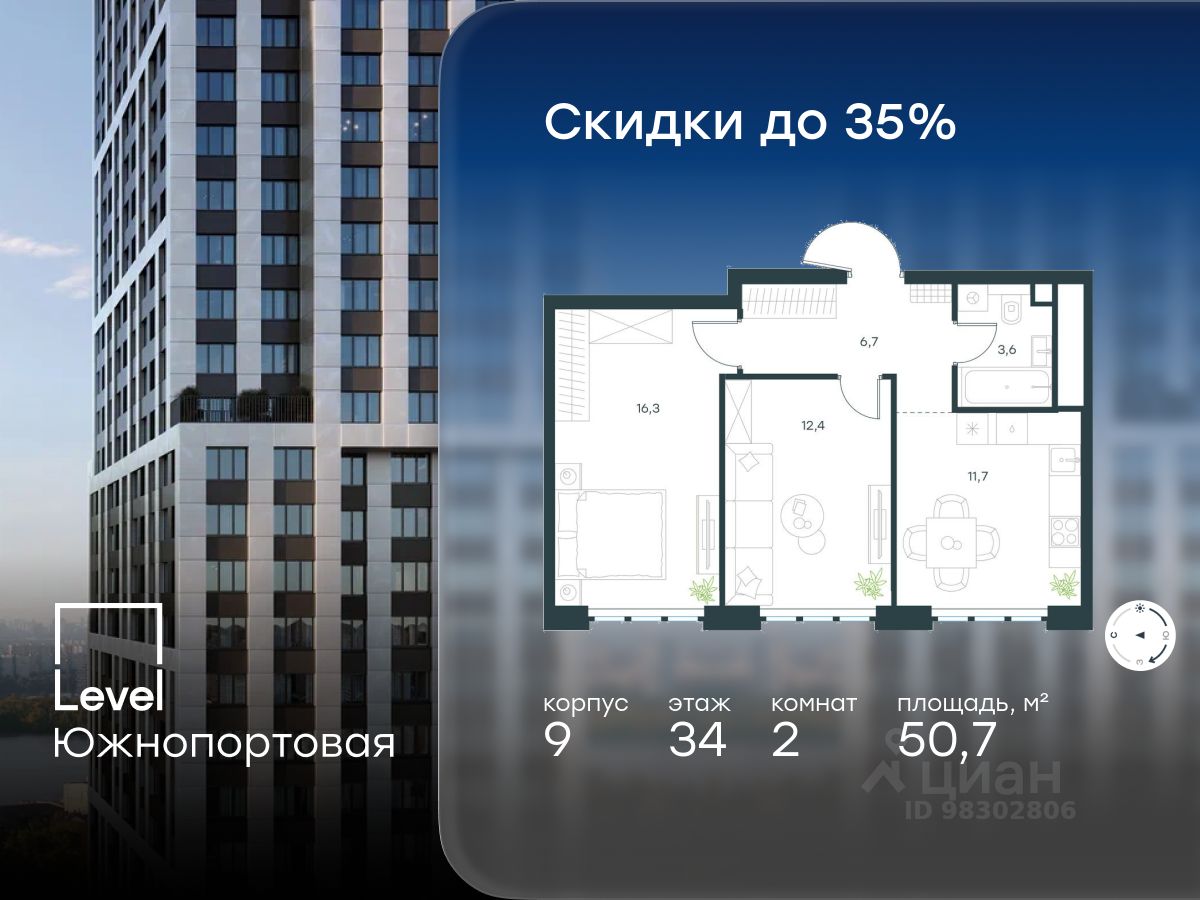 В северной части района Печатники продается 2-комнатная квартира площадью 50.70 кв.м с отделкой white box. Квартира расположена на 34 этаже 49-этажного корпуса 9 в жилом комплексе комфорт-класса Level Южнопортовая (компания Level Group/Левел групп).