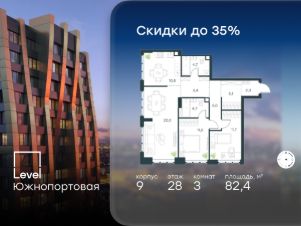 В северной части района Печатники продается 3-комнатная квартира площадью 82.40 кв.м с отделкой white box. Квартира расположена на 28 этаже 49-этажного корпуса 9 в жилом комплексе комфорт-класса Level Южнопортовая (компания Level Group/Левел групп).