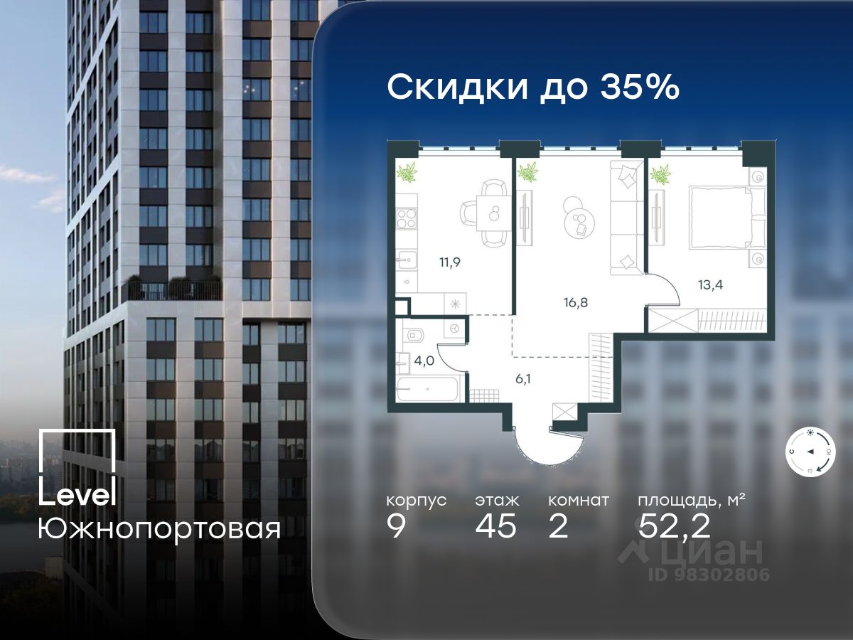 В северной части района Печатники продается 2-комнатная квартира площадью 52.20 кв.м с отделкой white box. Квартира расположена на 45 этаже 49-этажного корпуса 9 в жилом комплексе комфорт-класса Level Южнопортовая (компания Level Group/Левел групп).
