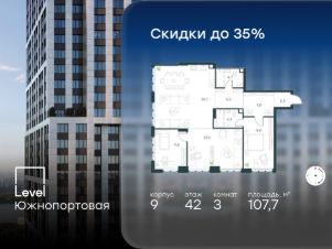 В северной части района Печатники продается 3-комнатная квартира площадью 107.70 кв.м с отделкой white box. Квартира расположена на 42 этаже 49-этажного корпуса 9 в жилом комплексе комфорт-класса Level Южнопортовая (компания Level Group/Левел групп).
