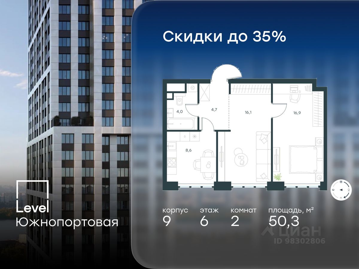 В северной части района Печатники продается 2-комнатная квартира площадью 50.30 кв.м с отделкой white box. Квартира расположена на 6 этаже 49-этажного корпуса 9 в жилом комплексе комфорт-класса Level Южнопортовая (компания Level Group/Левел групп).