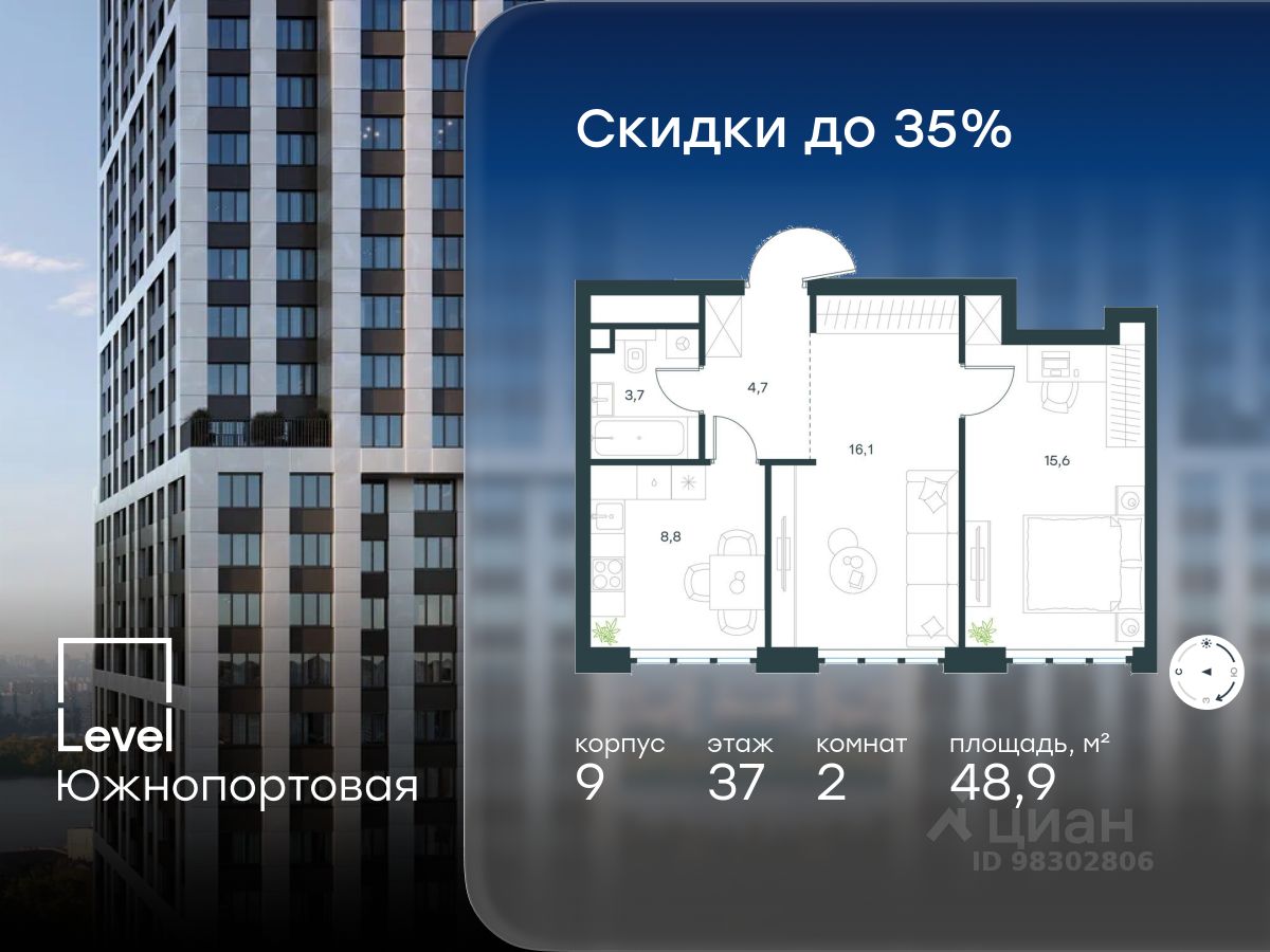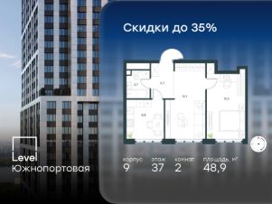 В северной части района Печатники продается 2-комнатная квартира площадью 48.90 кв.м с отделкой white box. Квартира расположена на 37 этаже 49-этажного корпуса 9 в жилом комплексе комфорт-класса Level Южнопортовая (компания Level Group/Левел групп).