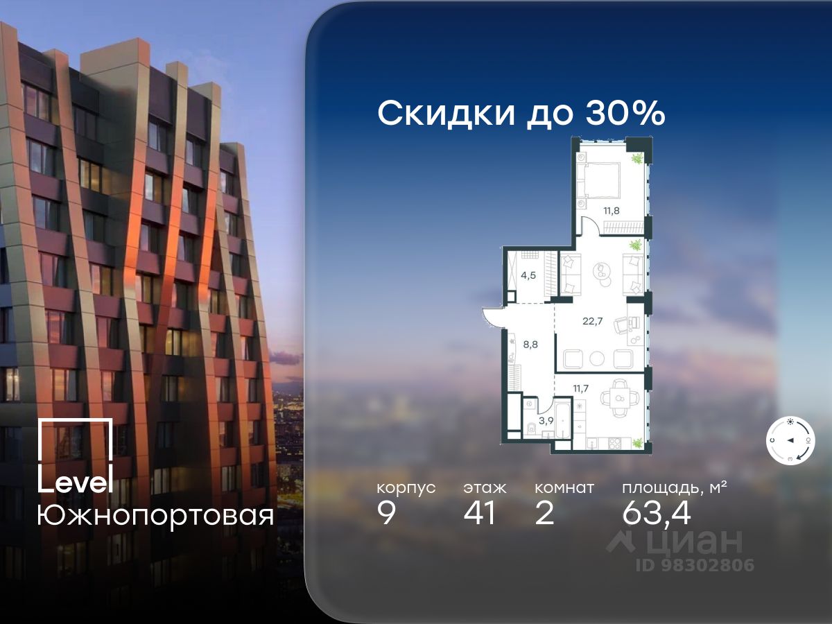 В северной части района Печатники продается 2-комнатная квартира площадью 63.40 кв.м с отделкой white box. Квартира расположена на 41 этаже 49-этажного корпуса 9 в жилом комплексе комфорт-класса Level Южнопортовая (компания Level Group/Левел групп).
