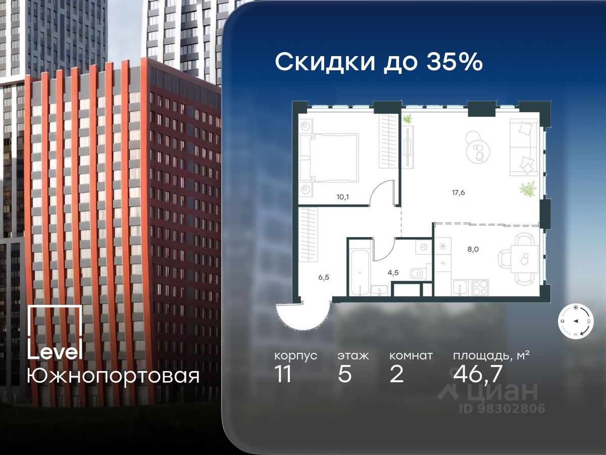 В северной части района Печатники продается 2-комнатная квартира площадью 46.70 кв.м без отделки. Квартира расположена на 5 этаже 16-этажного корпуса 11 в жилом комплексе комфорт-класса Level Южнопортовая (компания Level Group/Левел групп).