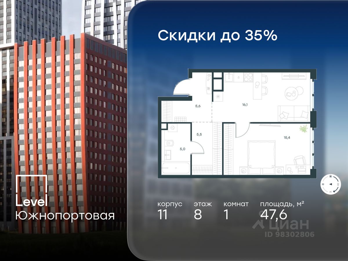 В северной части района Печатники продается 1-комнатная квартира площадью 47.60 кв.м без отделки. Квартира расположена на 8 этаже 16-этажного корпуса 11 в жилом комплексе комфорт-класса Level Южнопортовая (компания Level Group/Левел групп).