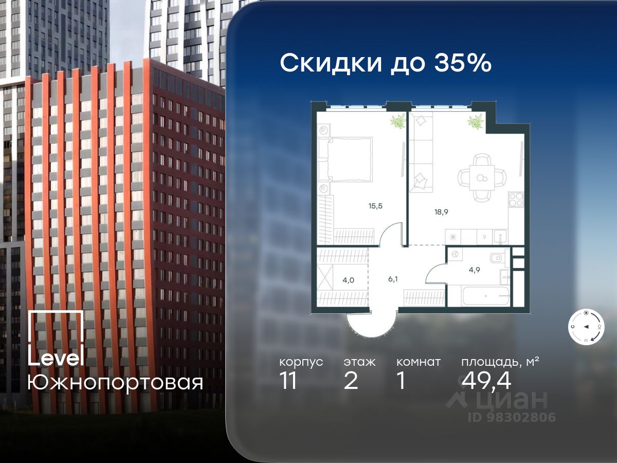 В северной части района Печатники продается 1-комнатная квартира площадью 49.40 кв.м без отделки. Квартира расположена на 2 этаже 16-этажного корпуса 11 в жилом комплексе комфорт-класса Level Южнопортовая (компания Level Group/Левел групп).
