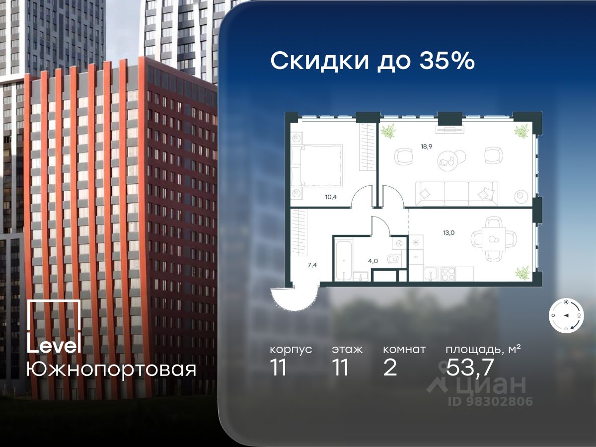 В северной части района Печатники продается 2-комнатная квартира площадью 53.70 кв.м без отделки. Квартира расположена на 11 этаже 16-этажного корпуса 11 в жилом комплексе комфорт-класса Level Южнопортовая (компания Level Group/Левел групп).