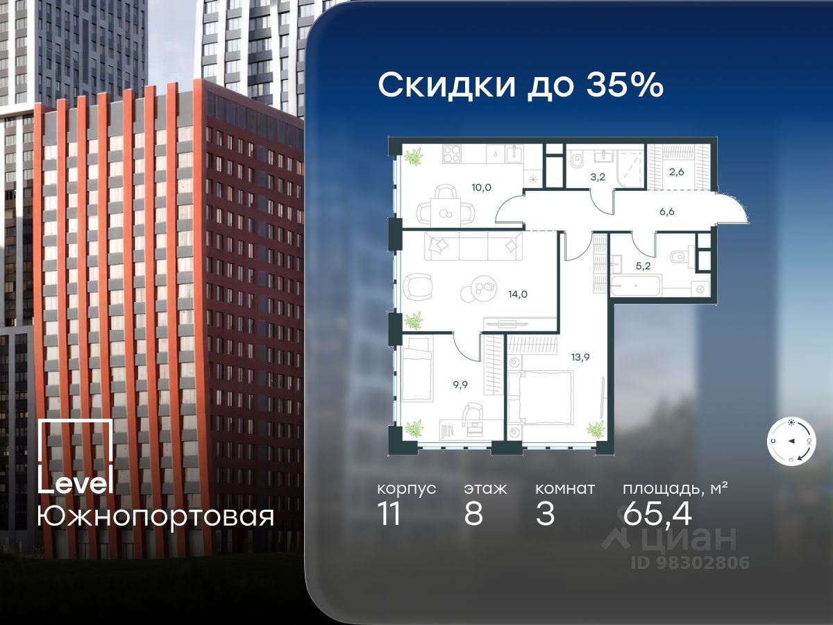 В северной части района Печатники продается 3-комнатная квартира площадью 65.40 кв.м без отделки. Квартира расположена на 8 этаже 16-этажного корпуса 11 в жилом комплексе комфорт-класса Level Южнопортовая (компания Level Group/Левел групп).