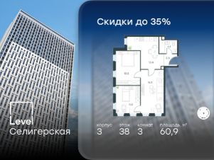 В жилом квартале, расположенном в южной части района Западное Дегунино, продаётся 3-комнатная квартира площадью 60.90 кв.м без отделки. Квартира расположена на 38 этаже 40-этажного корпуса 3 в жилом комплексе комфорт-класса Level Селигерская (компания Level Group/Левел групп).