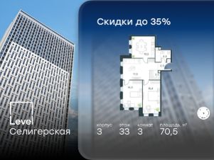 В жилом квартале, расположенном в южной части района Западное Дегунино, продаётся 3-комнатная квартира площадью 70.50 кв.м без отделки. Квартира расположена на 33 этаже 40-этажного корпуса 3 в жилом комплексе комфорт-класса Level Селигерская (компания Level Group/Левел групп).