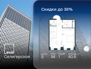 В жилом квартале, расположенном в южной части района Западное Дегунино, продаётся 1-комнатная квартира площадью 40.50 кв.м без отделки. Квартира расположена на 34 этаже 40-этажного корпуса 3 в жилом комплексе комфорт-класса Level Селигерская (компания Level Group/Левел групп).