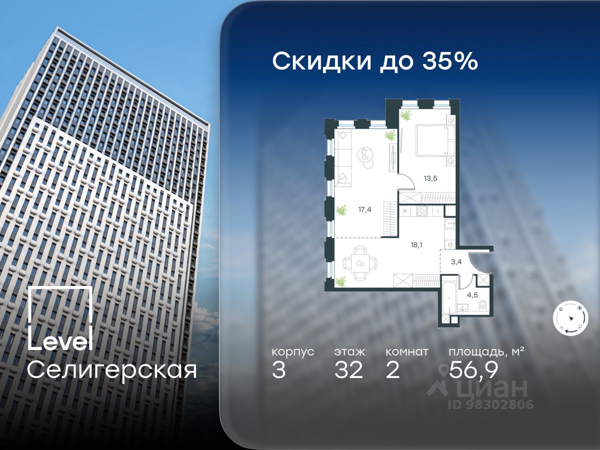 В жилом квартале, расположенном в южной части района Западное Дегунино, продаётся 2-комнатная квартира площадью 56.90 кв.м без отделки. Квартира расположена на 32 этаже 40-этажного корпуса 3 в жилом комплексе комфорт-класса Level Селигерская (компания Level Group/Левел групп).