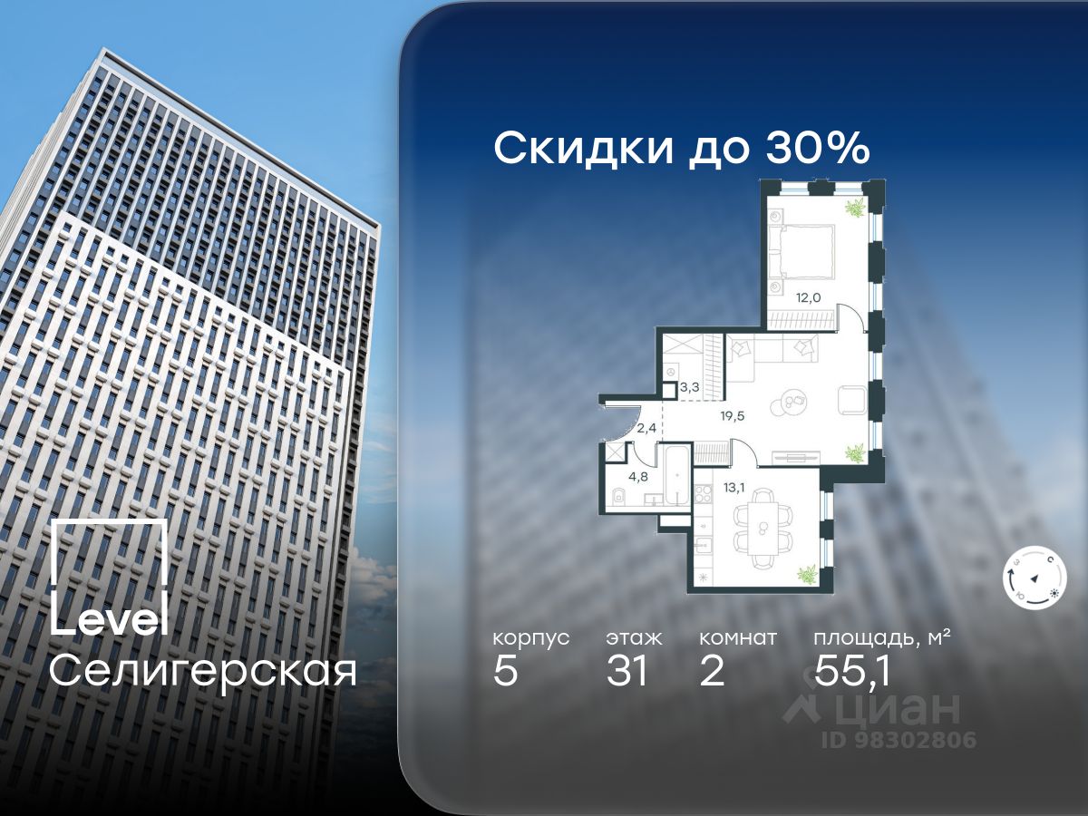 В жилом квартале, расположенном в южной части района Западное Дегунино, продаётся 2-комнатная квартира площадью 55.10 кв.м без отделки. Квартира расположена на 31 этаже 40-этажного корпуса 5 в жилом комплексе комфорт-класса Level Селигерская (компания Level Group/Левел групп).