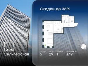 В жилом квартале, расположенном в южной части района Западное Дегунино, продаётся 1-комнатная квартира площадью 47.90 кв.м без отделки. Квартира расположена на 29 этаже 40-этажного корпуса 5 в жилом комплексе комфорт-класса Level Селигерская (компания Level Group/Левел групп).