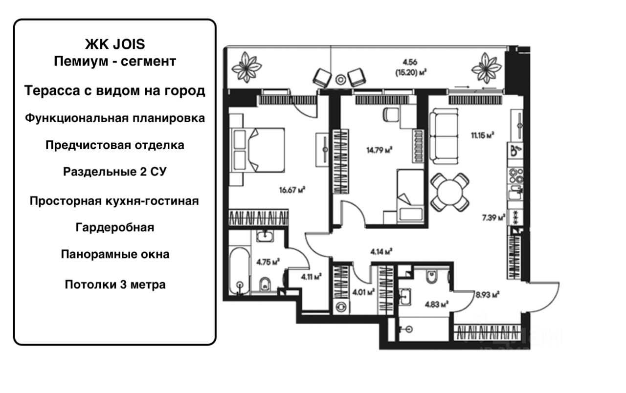Эксклюзивный лот в ЖК JOIS: Премиум-квартира 85 м² с просторной террасой и MR Base отделкой у метро