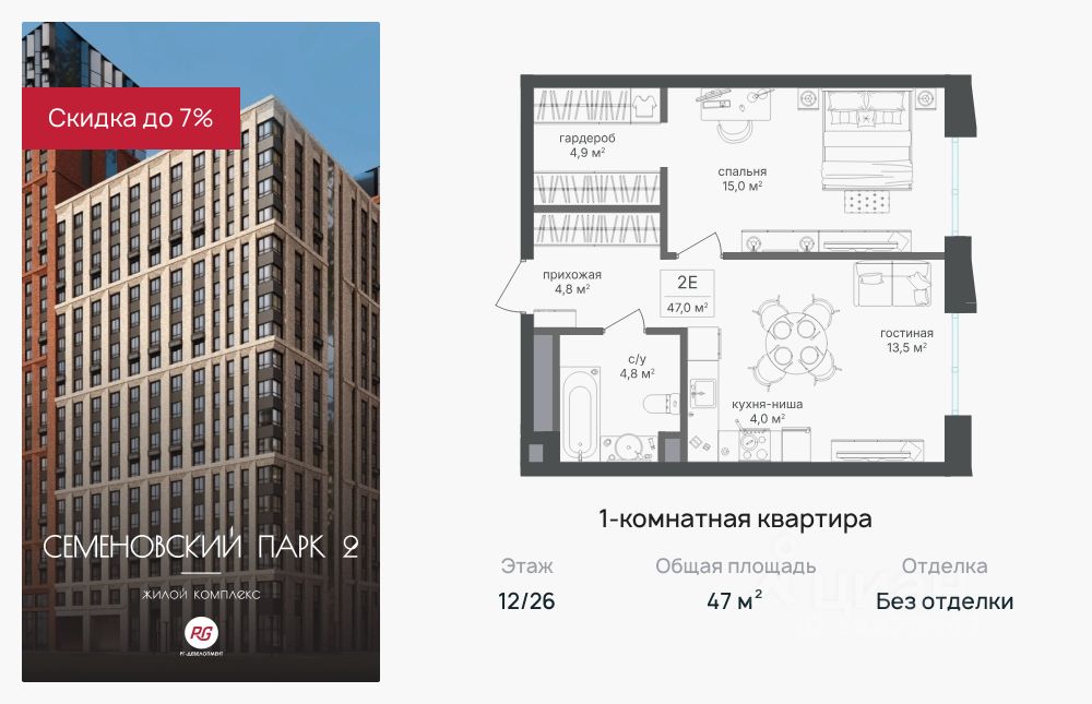 Продается 1-к квартира 47,0 кв.м. в ЖК "Семеновский парк 2" на 12-м этаже 26 этажного дома.