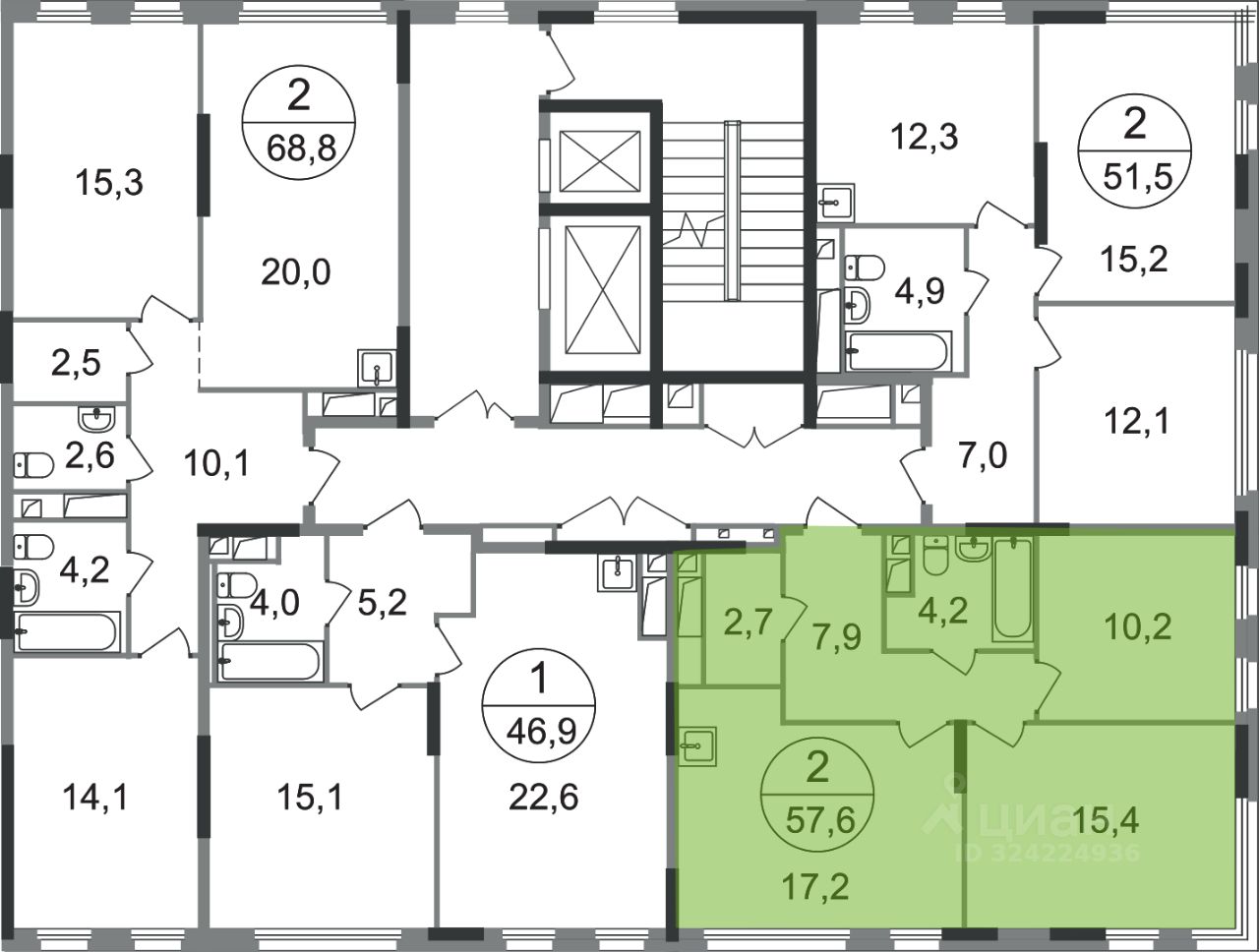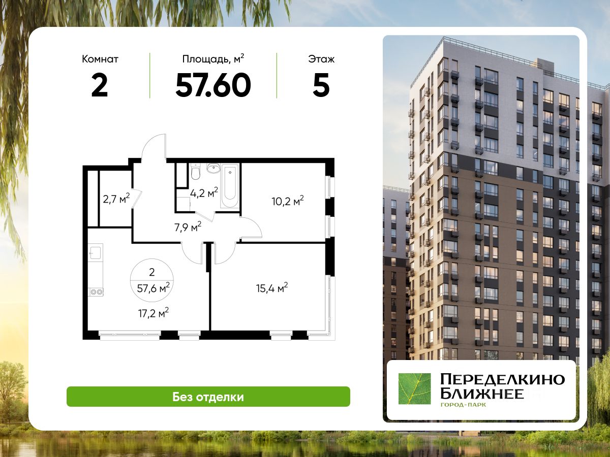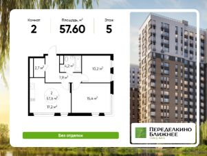 Общая площадь квартиры - 57,6 кв. м, этаж 5 из 17.