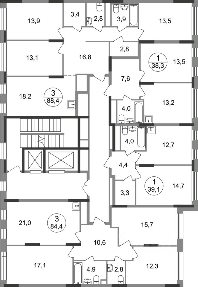 Корпус расположен в новой 13 фазе строительства и состоит из 8 секций с переменной этажностью 12-17 этажей. Все секции без отделки.