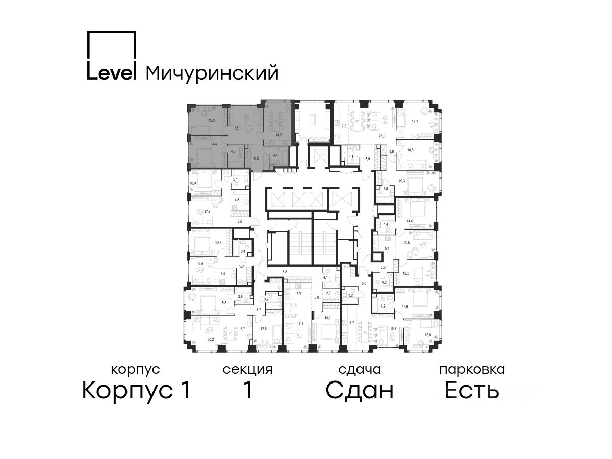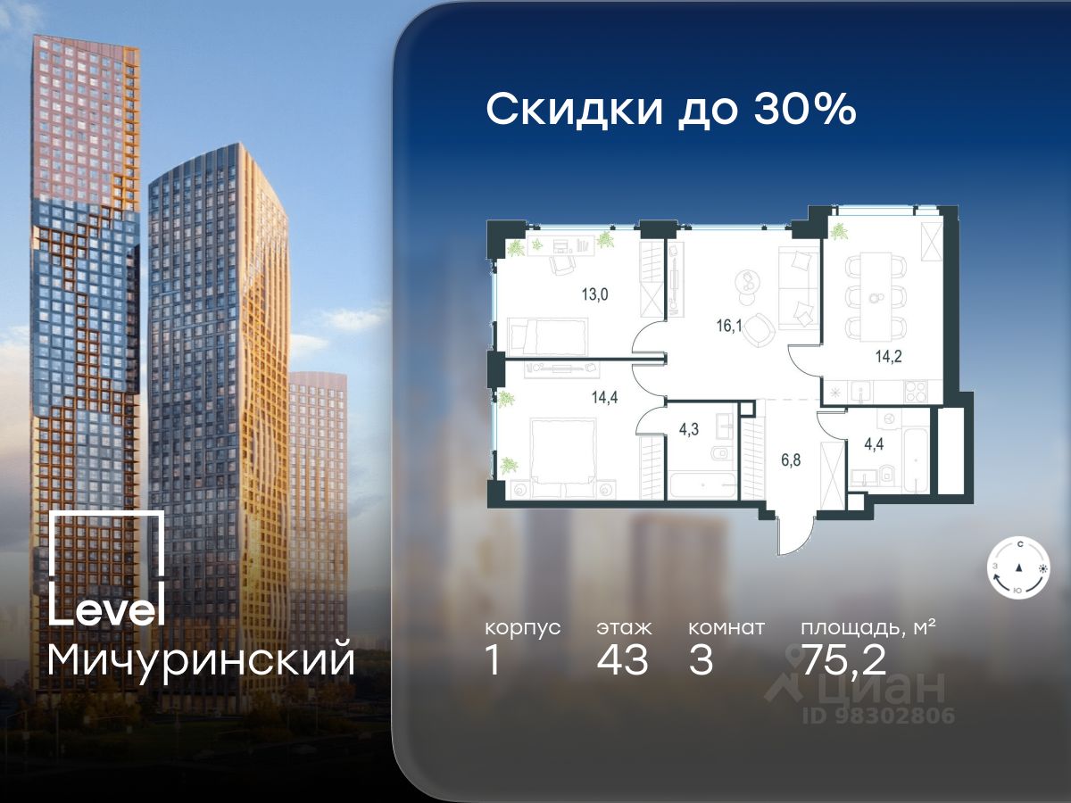 В жилом квартале, расположенном на границе с природным заказником "Долина реки Очаковки", продаётся 3-комнатная квартира площадью 75.20 кв.м без отделки. Квартира расположена на 43 этаже 54-этажного корпуса 1 в жилом комплексе бизнес-класса Level Мичуринский (компания Level Group/Левел групп).