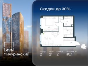 В жилом квартале, расположенном на границе с природным заказником "Долина реки Очаковки", продаётся 2-комнатная квартира площадью 40.10 кв.м без отделки. Квартира расположена на 21 этаже 42-этажного корпуса 2 в жилом комплексе бизнес-класса Level Мичуринский (компания Level Group/Левел групп).