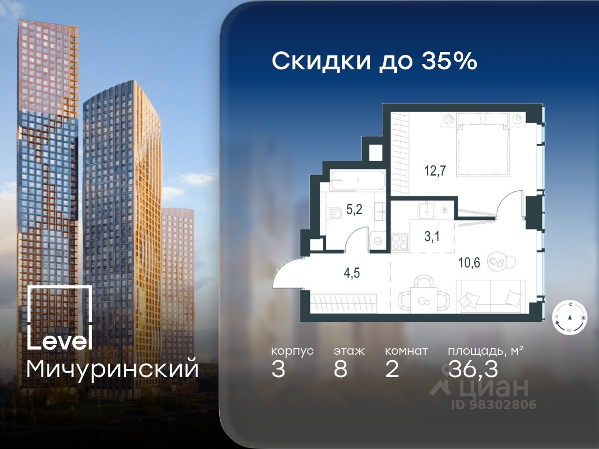 В жилом квартале, расположенном на границе с природным заказником "Долина реки Очаковки", продаётся 2-комнатная квартира площадью 36.30 кв.м с отделкой white box. Квартира расположена на 8 этаже 30-этажного корпуса 3 в жилом комплексе бизнес-класса Level Мичуринский (компания Level Group/Левел групп).