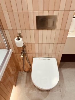Из кухни через пространственный портал мы попадаем в ванную комнату, которая являет собой отдельное пространство, выполненное в монохромной испанской терракотовой плитке.