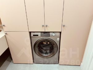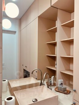 Все функции ванной объединяются в форму квадрата: до каждой потребности соблюдено одинаковое расстояние, с чистыми линиями и углами. В ванной также может разместиться полноценная прачечная за счет вертикального шкафа у стиральной машины: все моющие принадлежности аккуратно убираются на вместительные полки.