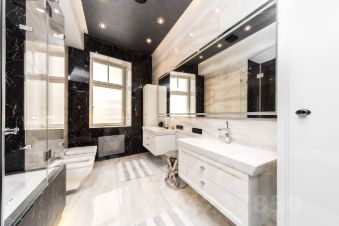 Клубный дом на 4 квартиры. ВЫСОКИЕ ПОТОЛКИ - 3,8 м. Просторная пятикомнатная квартира после ДИЗАЙНЕРСКОГО ремонта класса ЛЮКС с использованием дорогостоящих материалов - мрамор, натуральное дерево. Функциональная планировка: изолированная кухня - просторная гостиная с действующим ДРОВЯНЫМ КАМИНОМ - две спальни с своими санузлами - гостевая/детская спальня - кабинет (или комната свободного назначения), большая ГАРДЕРОБНАЯ КОМНАТА с окном, гостевой санузел. ИТОГО : 4 СПАЛЬНИ. 3 САНУЗЛА.