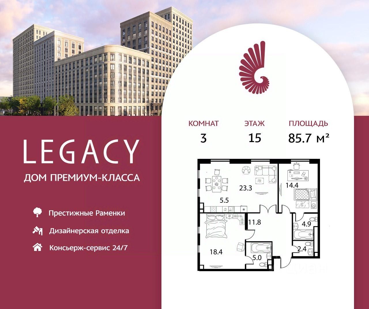 Светлая квартира общей площадью 83 м2 на 4-м этаже премиального жилого комплекса Legacy, расположенного в прекрасном зеленом районе Раменки.