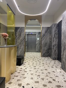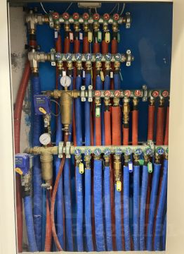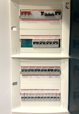 Стены окрашены в спокойные тона, зоны плитки на полу с подогревом, дорогая серия розеток и выключателей Schneider Electric, кондиционеры Mitsubishi в кухне и спальне.