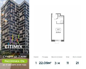 Продаётся студия в строящемся доме (Корпус 4), срок сдачи: III-кв. 2026, общей площадью 22.09 кв.м., на 11 этаже.