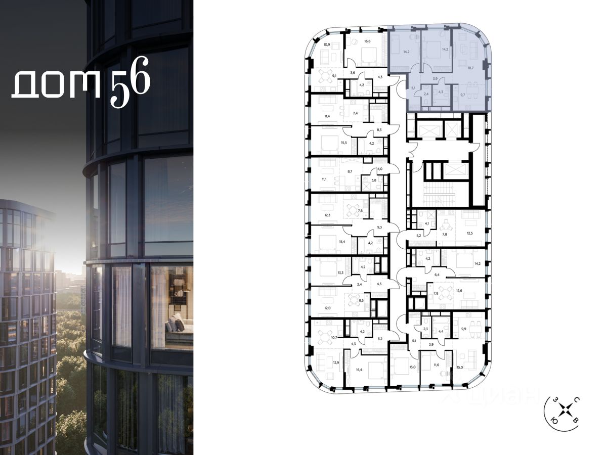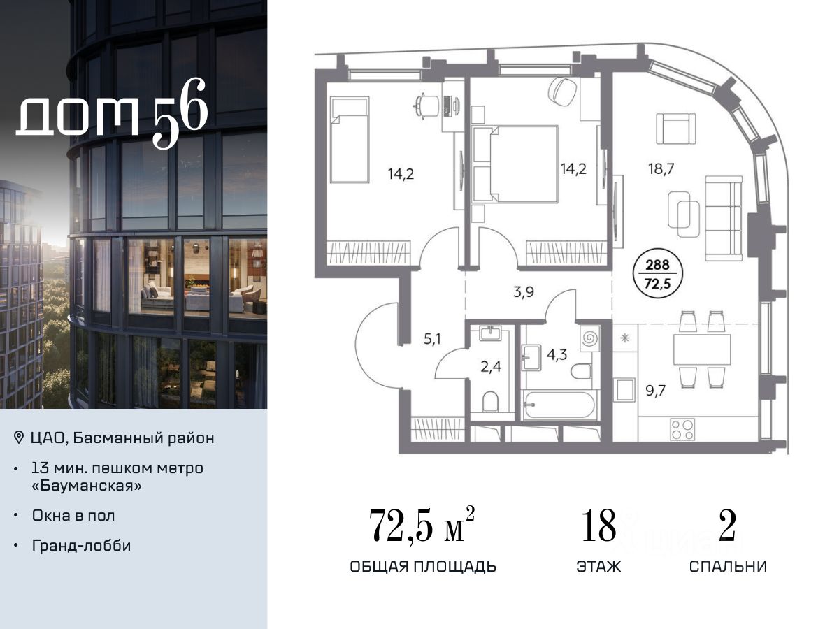 В премиум-квартале "Дом 56" на Бауманской напрямую от девелопера ГК "Галс-Девелопмент" представлена 2-комнатная квартира на 18 этаже общей площадью 72.50 м².