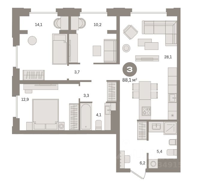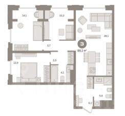 Квартира с кухней-гостиной и тремя спальнями в квартале МОНС