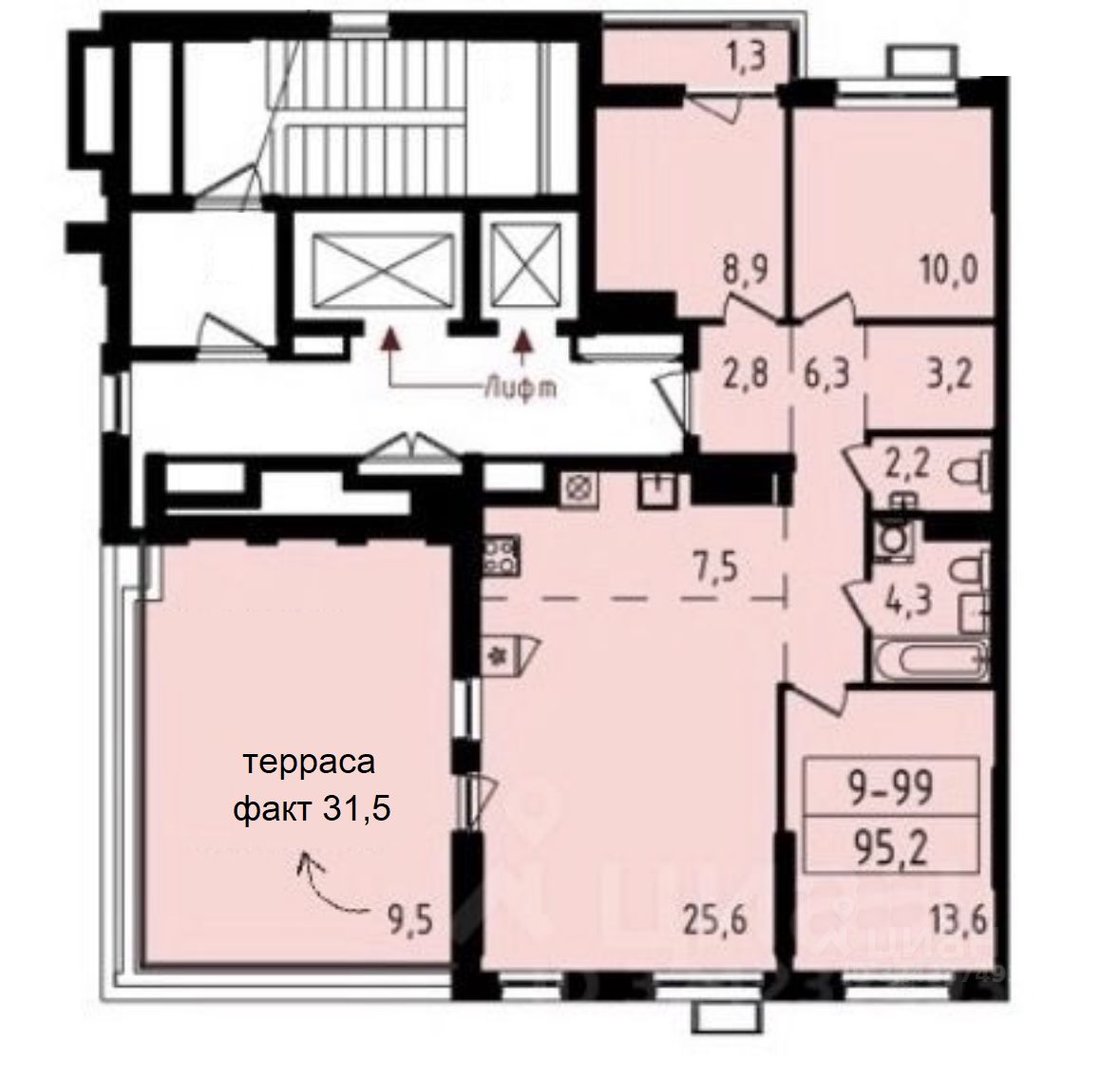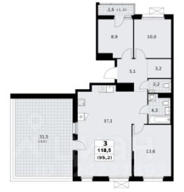 По бти 95,2 кв.м. Фактическая официальная площадь 118,5 кв.м. Терраса 31,5 кв.м. (по бти с учетом коэффициента 9,5 кв.м). Выше окон нет.