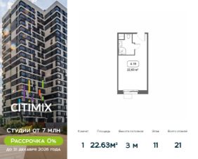 Продаётся студия в строящемся доме (Корпус 4), срок сдачи: III-кв. 2026, общей площадью 22.63 кв.м., на 11 этаже.