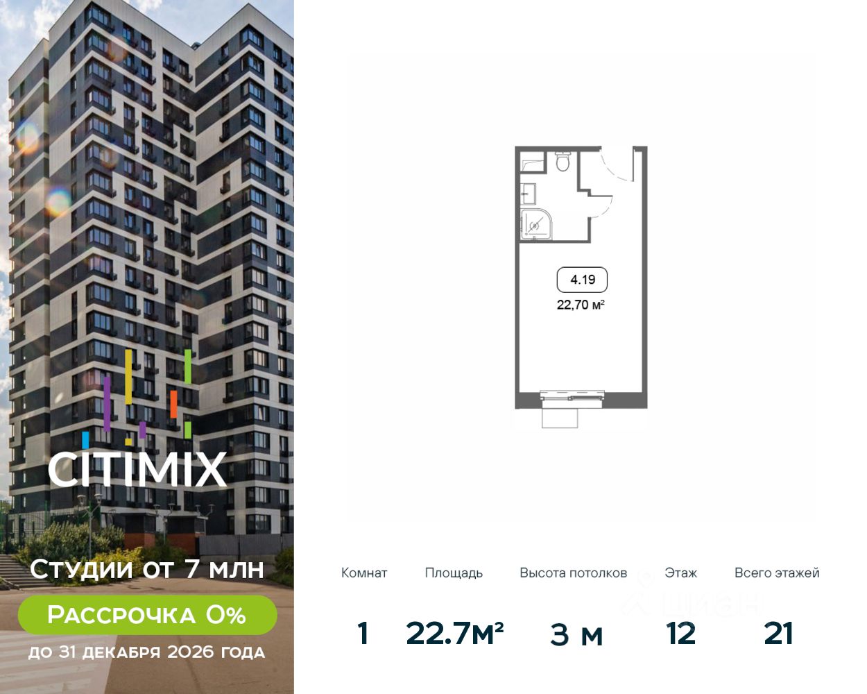 Продаётся студия в строящемся доме (Корпус 4), срок сдачи: III-кв. 2026, общей площадью 22.7 кв.м., на 12 этаже.