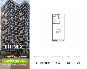 Продаётся студия в строящемся доме (Корпус 4), срок сдачи: III-кв. 2026, общей площадью 21.86 кв.м., на 14 этаже.