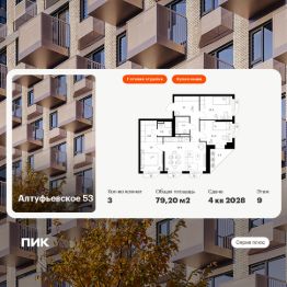 Продаётся 3-комн. квартира площадью 79,2 кв.м на 9 этаже 32 этажного дома (Корпус 1.1, Секция 2) проекта ПИК Алтуфьевское 53. Светлый просторный подъезд на уровне земли, функциональная планировка, большие окна, c отделкой.